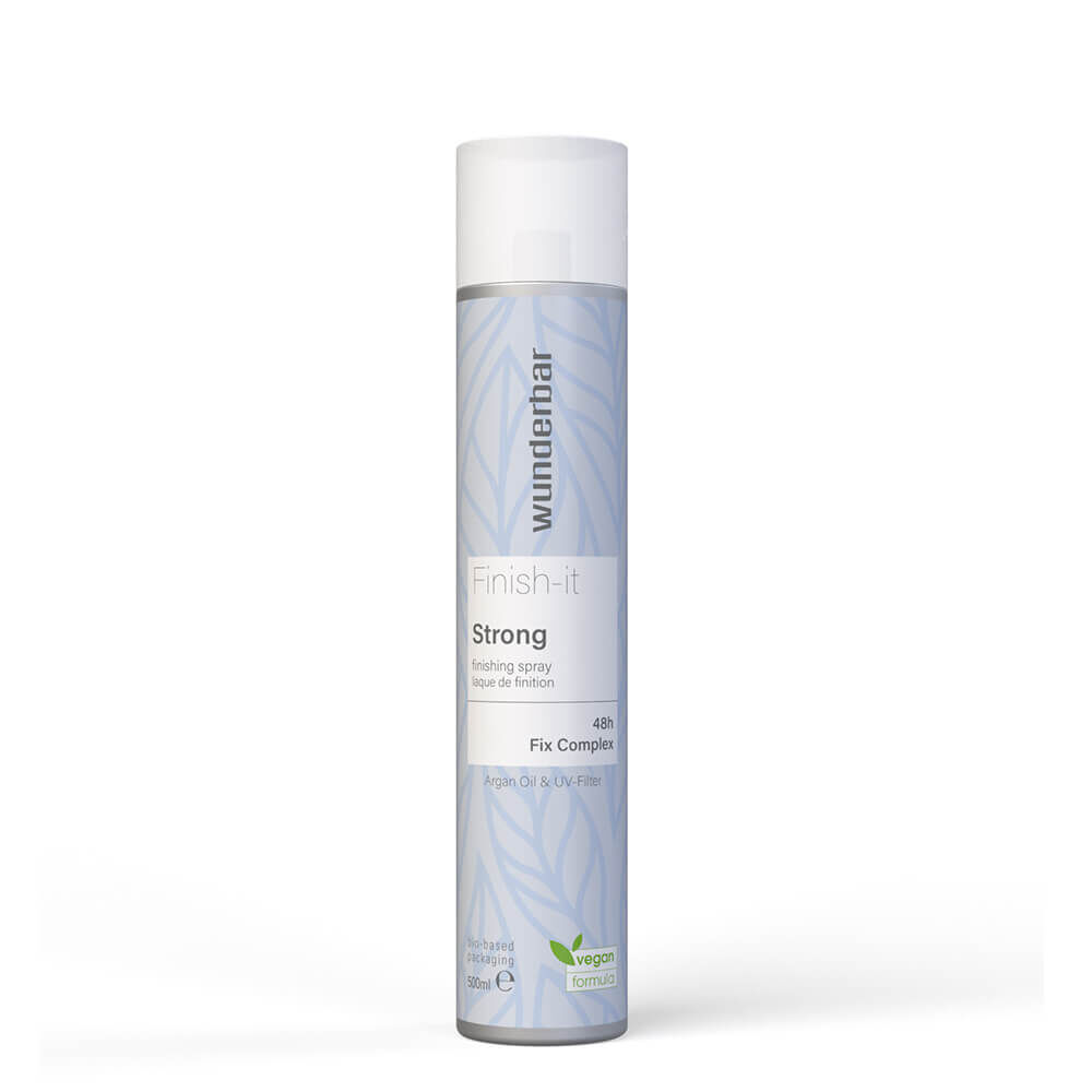 La laque Finish-It de Wunderbar offre une tenue idéale pour les cheveux longs. Végan et à séchage rapide, elle permet de styliser sans résidu. Le Fix Complexe 48h avec résines à effet mémoire permet de retravailler la coiffure tout en préservant les cheveux.